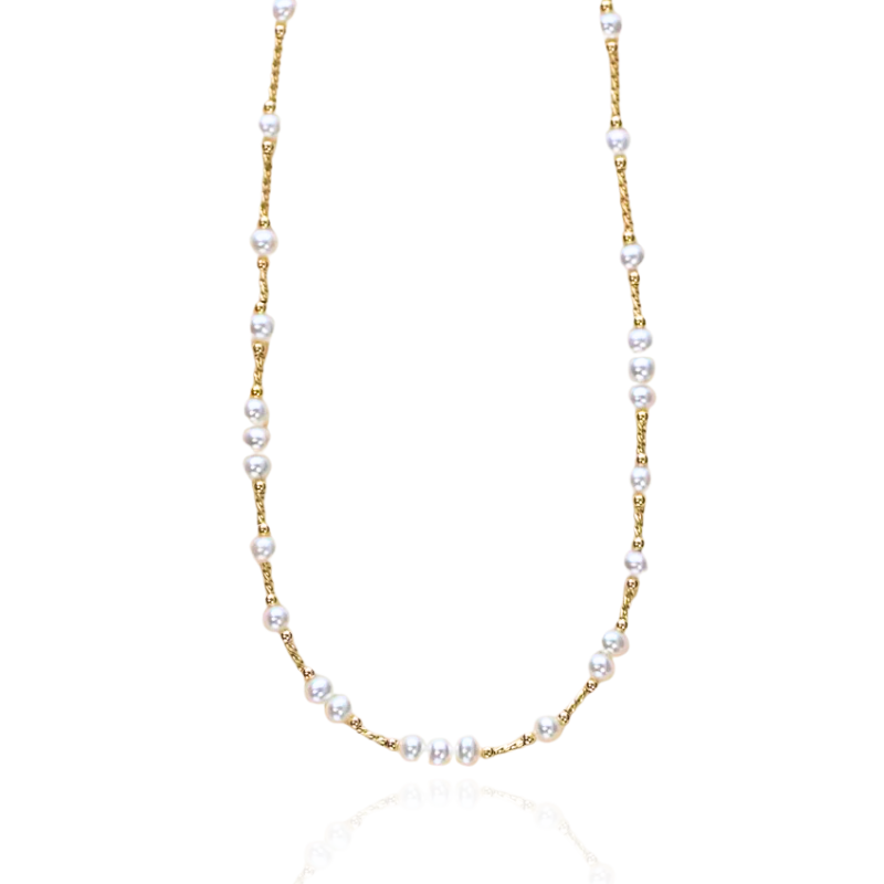Indulge in luxury with our Ophelia Pearl Choker. The delicate strand of pearls, twisted gold beads, and gold bead balls creates a unique and irregular design, perfect for layering and adding a touch of elegance to any outfit.